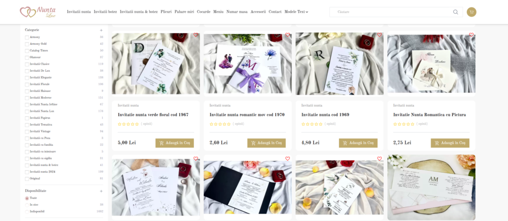 The wedding invitations page from Nunta-Lux is a practical and well-stocked place for browsing invitatii de nunta. The broad variety of styles, the easy filtering and the personalization options make it a solid choice for couples who want real, printed invitations without too much hassle. The page does feel crowded at times, and clearer review signals or better management of unavailable items would improve the experience. But as a working tool for choosing wedding stationery, it gets the job done and gives couples more than enough material to find something that matches their wedding style, budget and personality.
